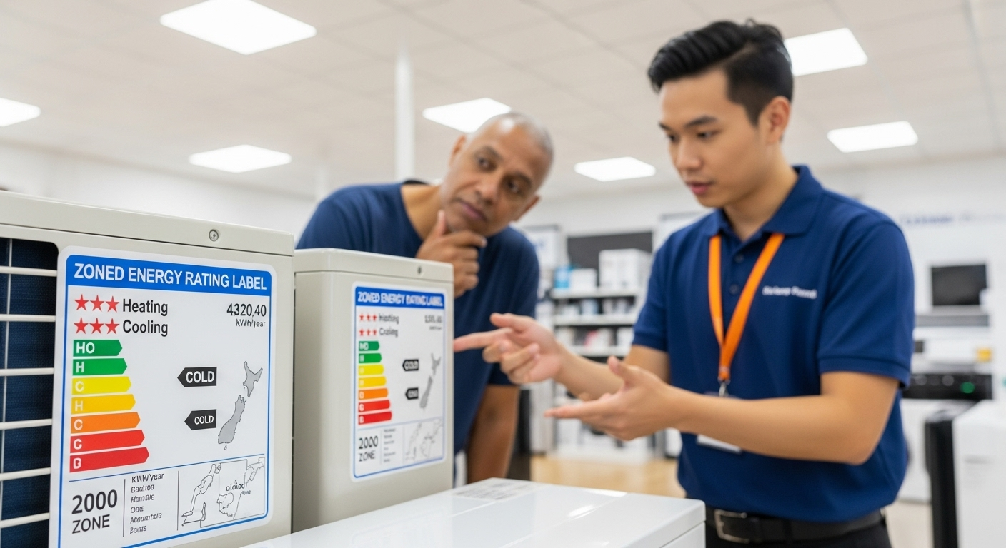 In recent years, the industry moved to the Zoned Energy Rating Label (ZERL). This updated label provides more detail because it recognises that a heat pump works differently in the humid warmth of Auckland compared to the freezing winters of Invercargill. The ZERL features a map with three climate zones: hot, average, and cold.